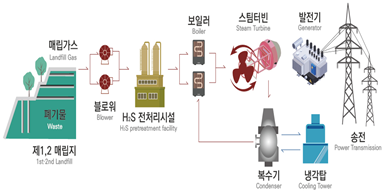 매립가스는 땅에 묻혀 혐기성 분해23단계에서 메탄가스가 발생하여 이를 포집하고 황산화물을 제외하여 연소를 통해 전력 및 열에너지를 생산한다. 대표적으로 수도권매립지 등에서 재생에너지를 생산하고 있다.